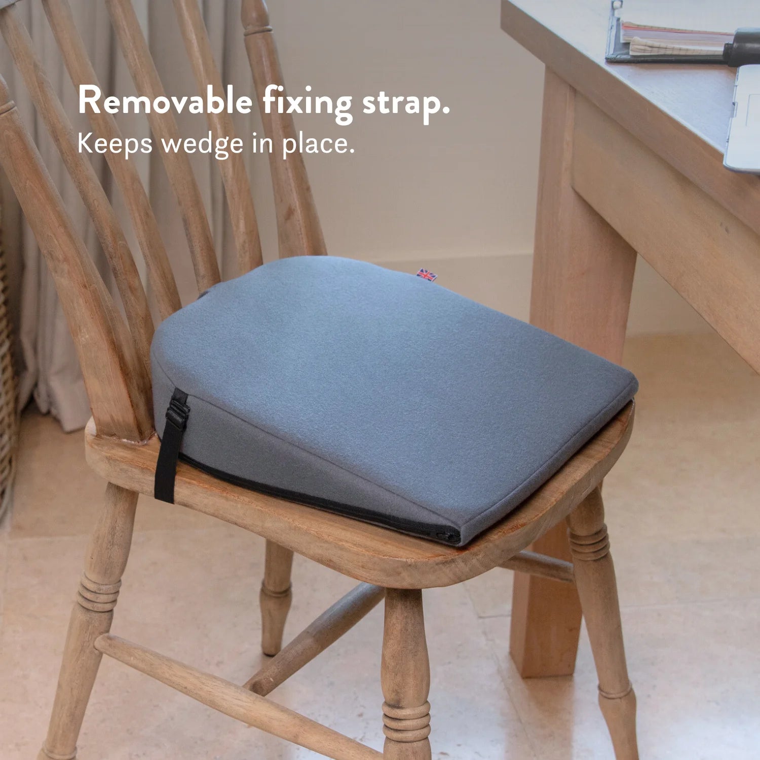 La housse ajustée est zippée et lavable, et comprend une poignée de transport intégrée. Le coussin est également fourni avec une sangle de fixation réglable (et amovible) pour le maintenir en place.